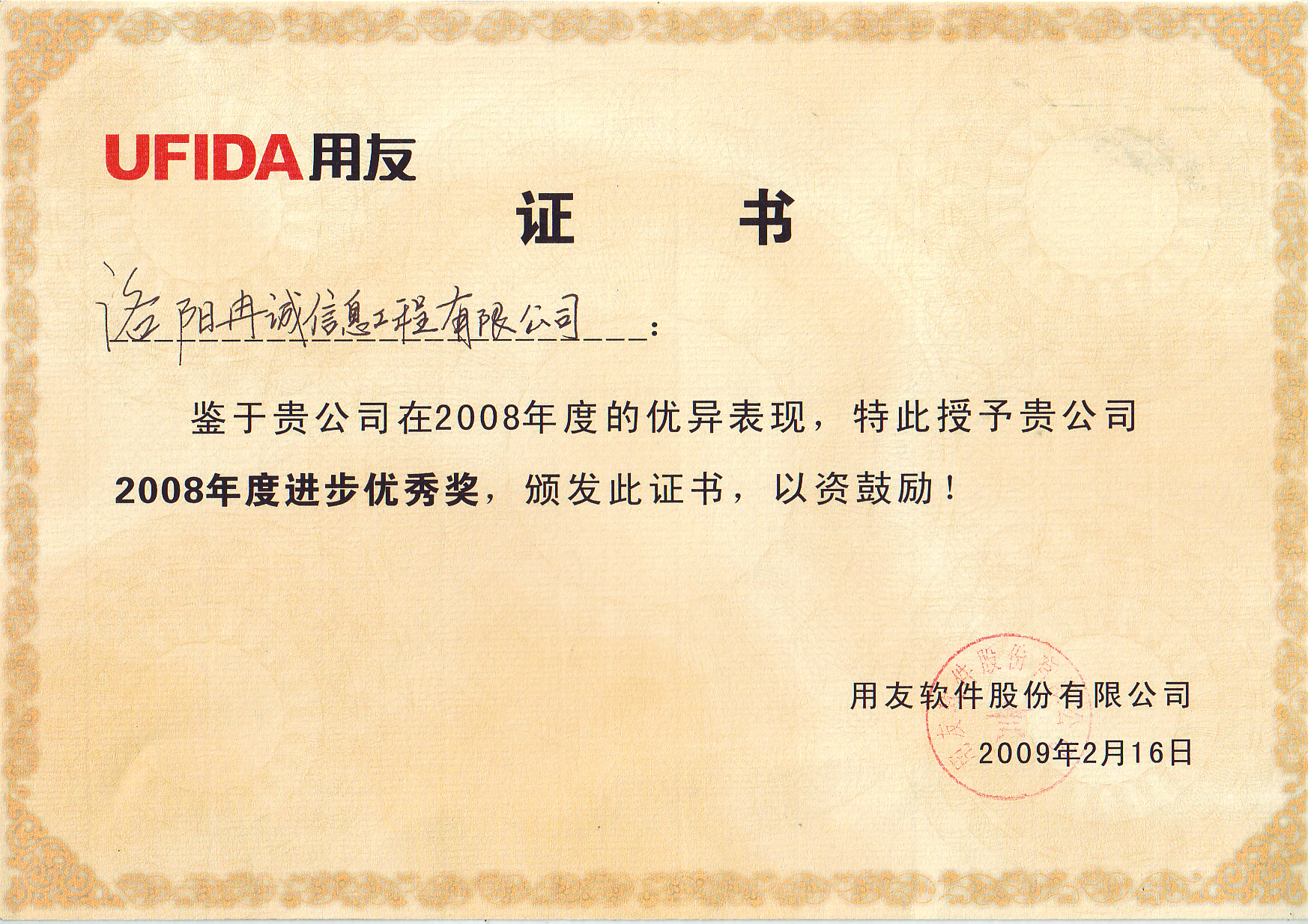 2008年度進(jìn)步獎(jiǎng) 發(fā)布時(shí)間:2021-08-03點(diǎn)擊:1099 上一篇:用友2009年銀牌授權(quán)證書 下一篇:用友ERP年度服務(wù)獎(jiǎng)