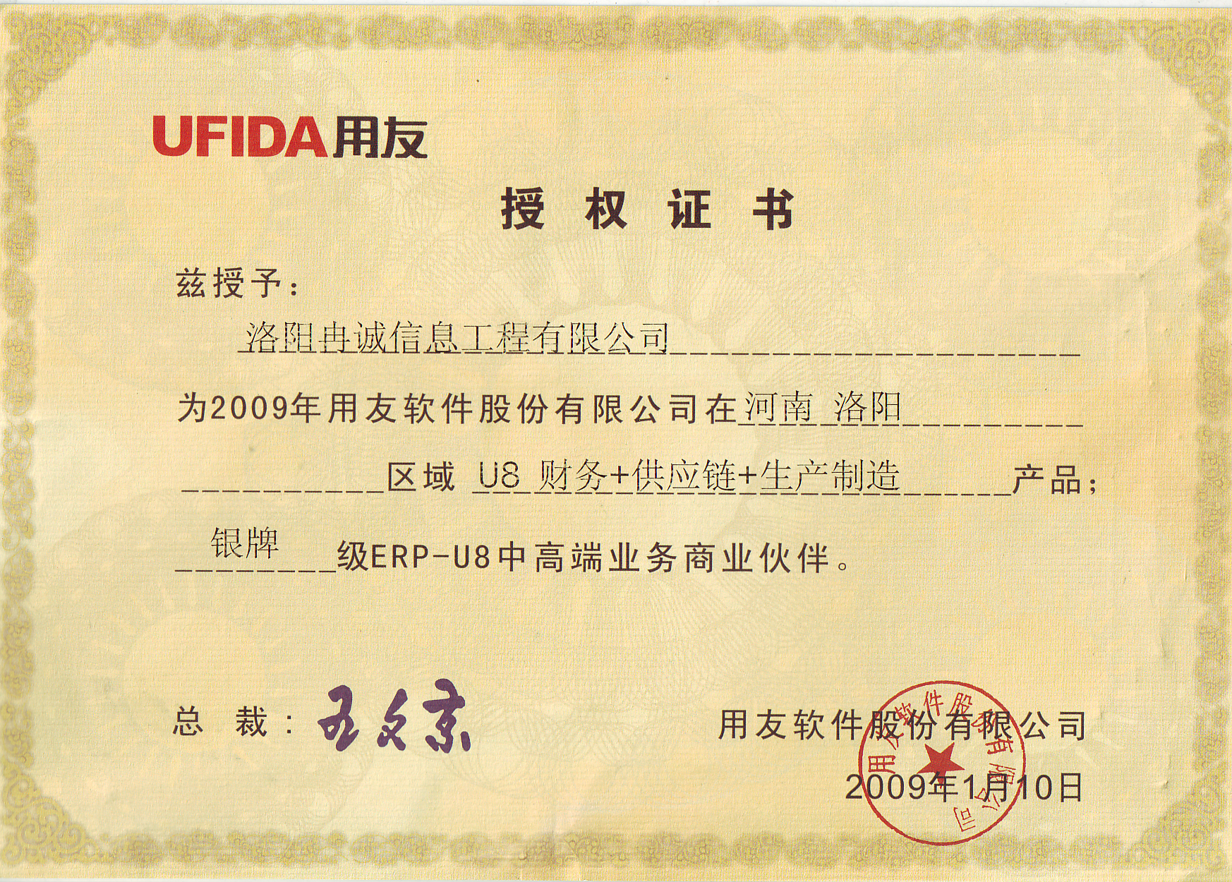 用友2009年銀牌授權(quán)證書 發(fā)布時(shí)間:2021-08-03點(diǎn)擊:1233 上一篇:2010年度杰出業(yè)績貢獻(xiàn)獎(jiǎng) 下一篇:2008年度進(jìn)步獎(jiǎng)
