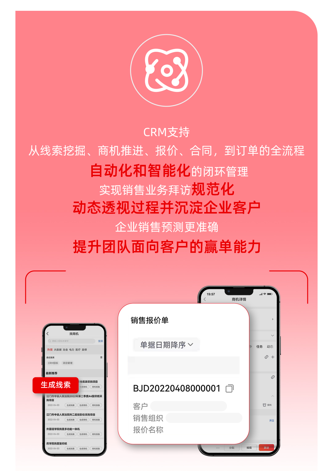YonSuite全新的客戶關(guān)系管理服務(wù)支持從線索挖掘、商機推進、報價、合同、訂單的全流程自動化智能化的閉環(huán)管理,讓銷售管理變得更為簡單。同時,還能動態(tài)透視過程并沉淀企業(yè)客戶,企業(yè)銷售預(yù)測更準確,從此贏單不再難。