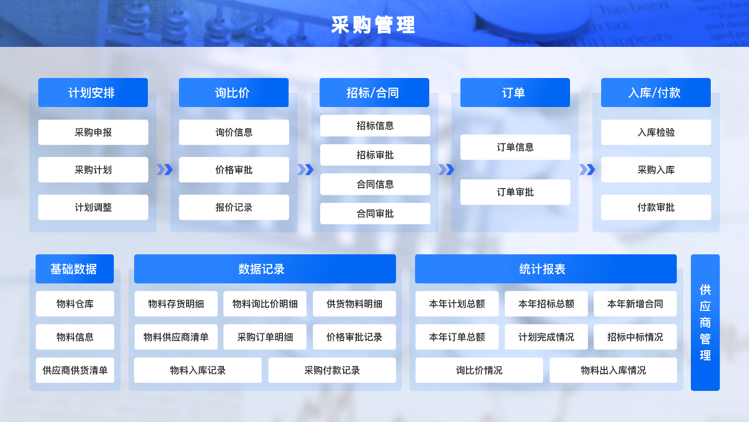 完善的信息數(shù)據(jù)與各種檔案,記錄物資采購的歷史情況,根據(jù)這些數(shù)據(jù),可以分析采購需求、優(yōu)化采購計(jì)劃、同時以此分析和優(yōu)選供應(yīng)商。