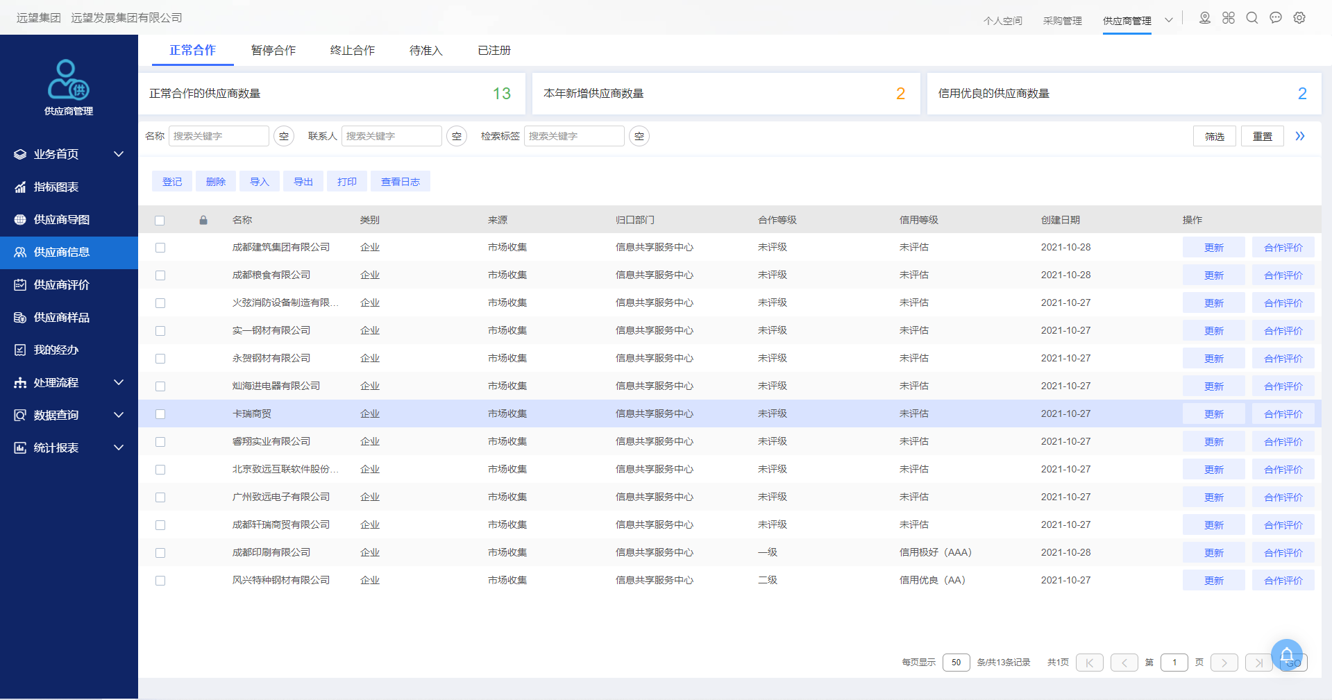 將供應(yīng)商的信息檔案作為供應(yīng)商管理的核心,從供應(yīng)商注冊、考察評價、準(zhǔn)入審批、樣品管理到合作評價、等級評定、信用平臺、問題整改直至供應(yīng)商的退出或停止合作,全過程均納入管理,從而提升單位、企業(yè)對供應(yīng)商信息的全方面掌握,強(qiáng)化對供應(yīng)商的管控。