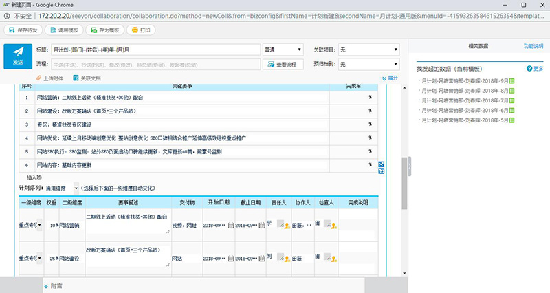 計(jì)劃發(fā)起適合個(gè)人/部門周、月計(jì)劃。用于對(duì)長(zhǎng)期計(jì)劃任務(wù)的重要事項(xiàng)、日常事項(xiàng)、臨時(shí)事項(xiàng)的落地執(zhí)行。