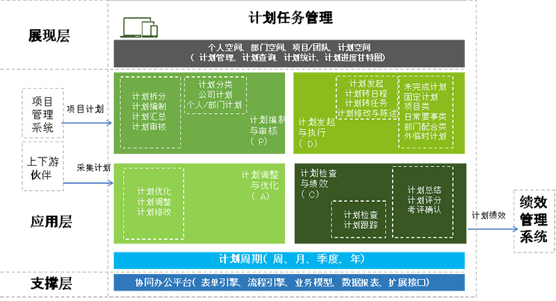計(jì)劃任務(wù)管理遵循閉環(huán)的PDCA過(guò)程,通過(guò)幾個(gè)環(huán)節(jié)和步驟實(shí)現(xiàn)完整的計(jì)劃過(guò)程管理,基本應(yīng)用分為四大塊: